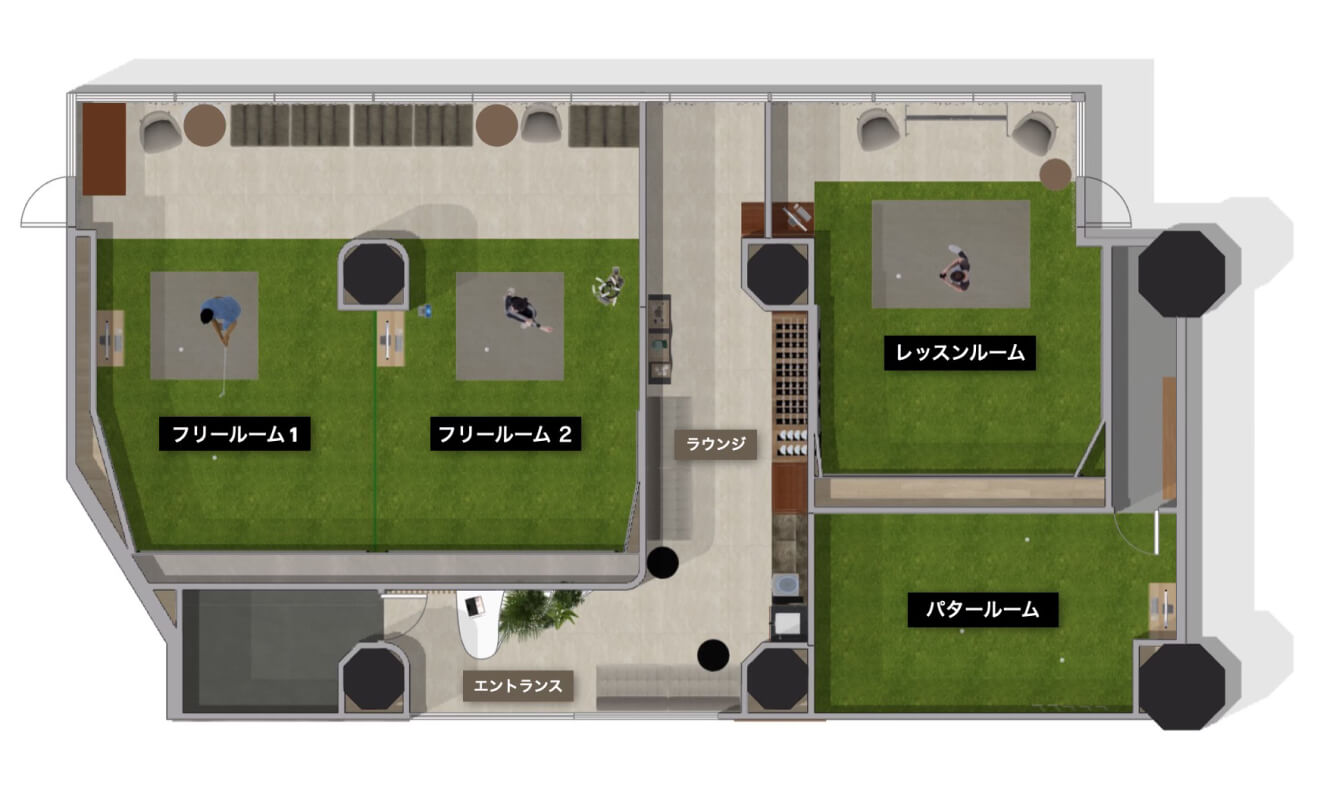 練習に集中全打席、視線を区切った半個室タイプで、周囲の目を気にすることなくご自分のペースで練習に集中していただけます。ラウンジは上質なインテリア空間とフリードリンクで練習前後もゆったりとお過ごしください。